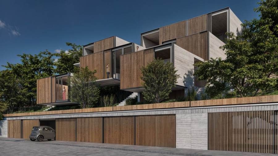 Nueve viviendas unifamiliares escalonadas en ladera con vistas a la ría. Arquitectura integrada en el paisaje singular de las Rías Baixas.